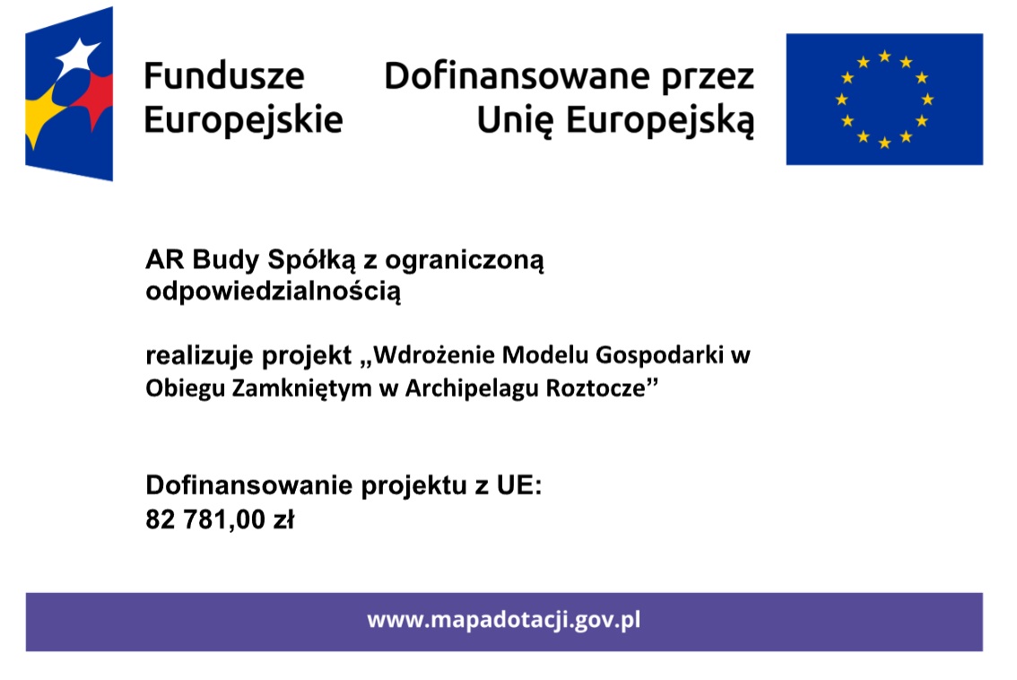 Firma AR Budy Spółka z ograniczoną odpowiedzialnością realizuje projekt: Wdrożenie Modelu Gospodarki w Obiegu Zamkniętym w Archipelagu Roztocze. Celem projektu jest Przygotowanie modelu biznesowego GOZ- transformacji W ramach działania przygotowania modelu biznesowego GOZ-transformacji zostanie przeprowadzony audyt firmy, analiza przedsiębiorstwa, charakterystyka działalności, zidentyfikowanie obszarów wymagających uwagi w kontekście wymogów środowiskowych, opracowanie założeń projektu GOZ, analiza konkretne segmenty działalności do zmian w kierunku GOZ, analiza struktury kosztów i wskaźników, zarządzanie ryzykiem w projekcie GOZ, analiza modelu biznesowego, spostrzeżenia i rekomendacje dotyczące obecnego stanu oraz przyszłych zmian w modelu biznesowym, rekomendacje i wytyczne do wdrożenia modelu biznesowego GOZ- transformacji. W wyniku realizacji projektu zostanie opracowan model biznesowy GOZ-transformacji AR Budy Spółka z ograniczoną odpowiedzialnością zawierający rekomendacje i wytyczne do wdrożenia modelu biznesowego GOZ- transformacji. Całkowita wartość projektu 82 781,00 zł Wysokość wkładu Funduszy Europejskich 82 781,00 zł